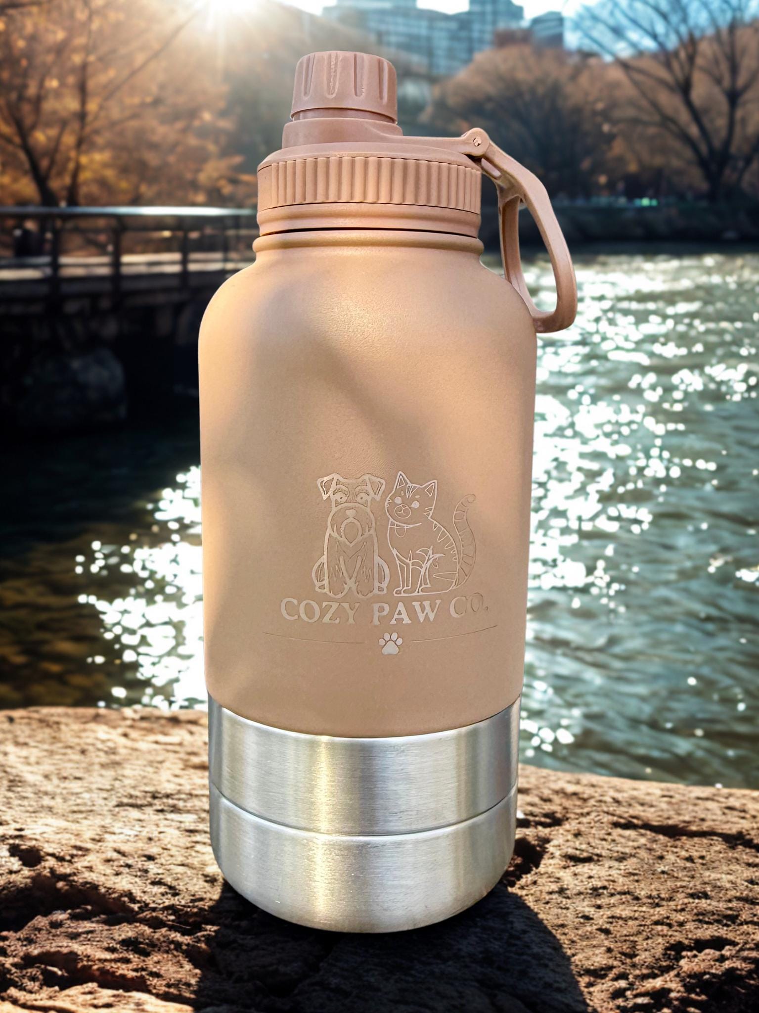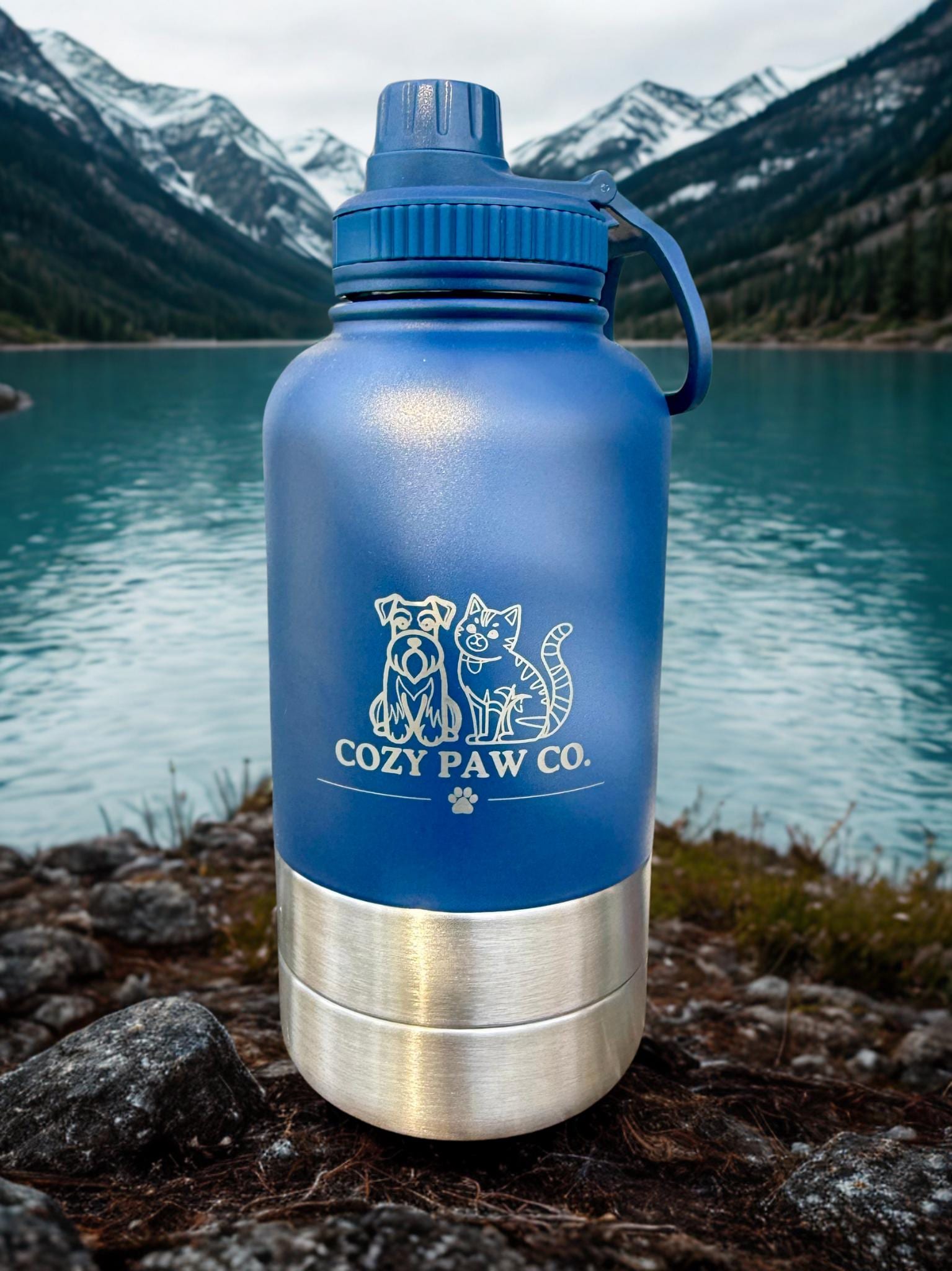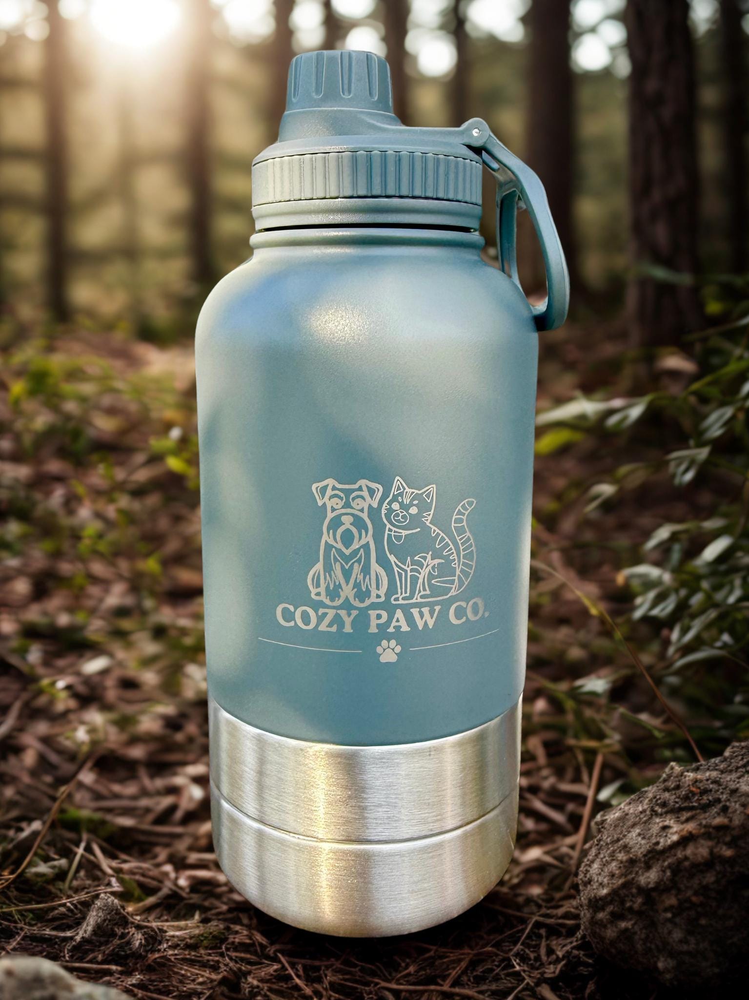 2in1 Summer-Ready Dog Travel Bottle – 1L Insulated Stainless Steel with Built-in Bowls, Leak-Proof for Hiking & Beach Trips