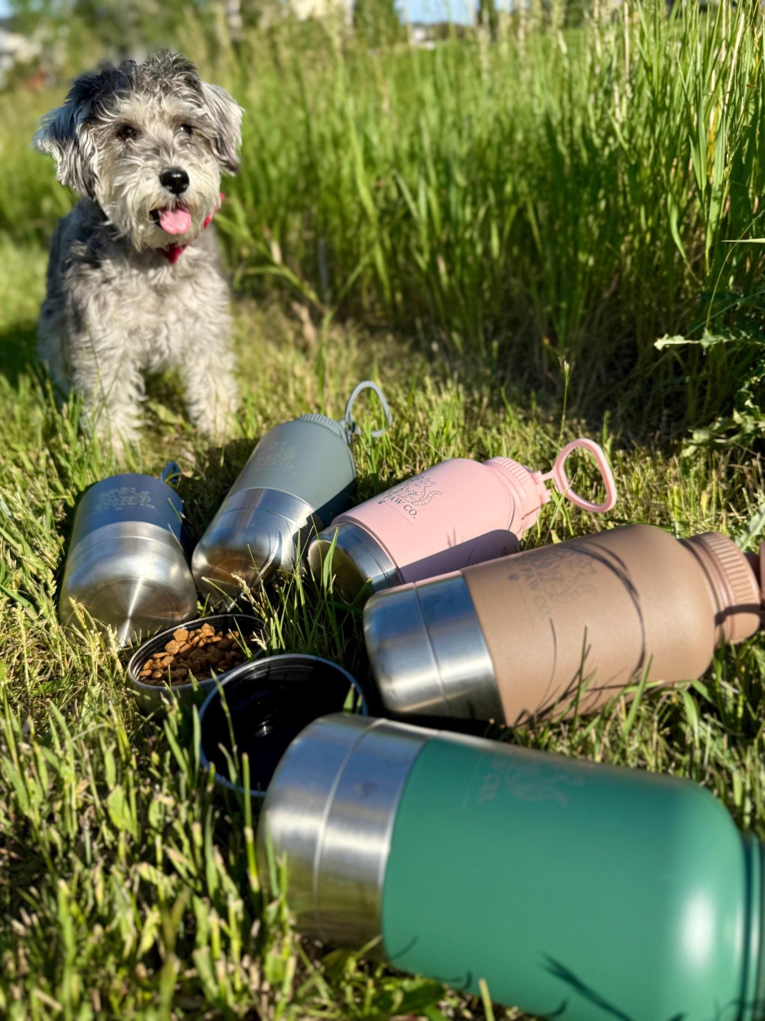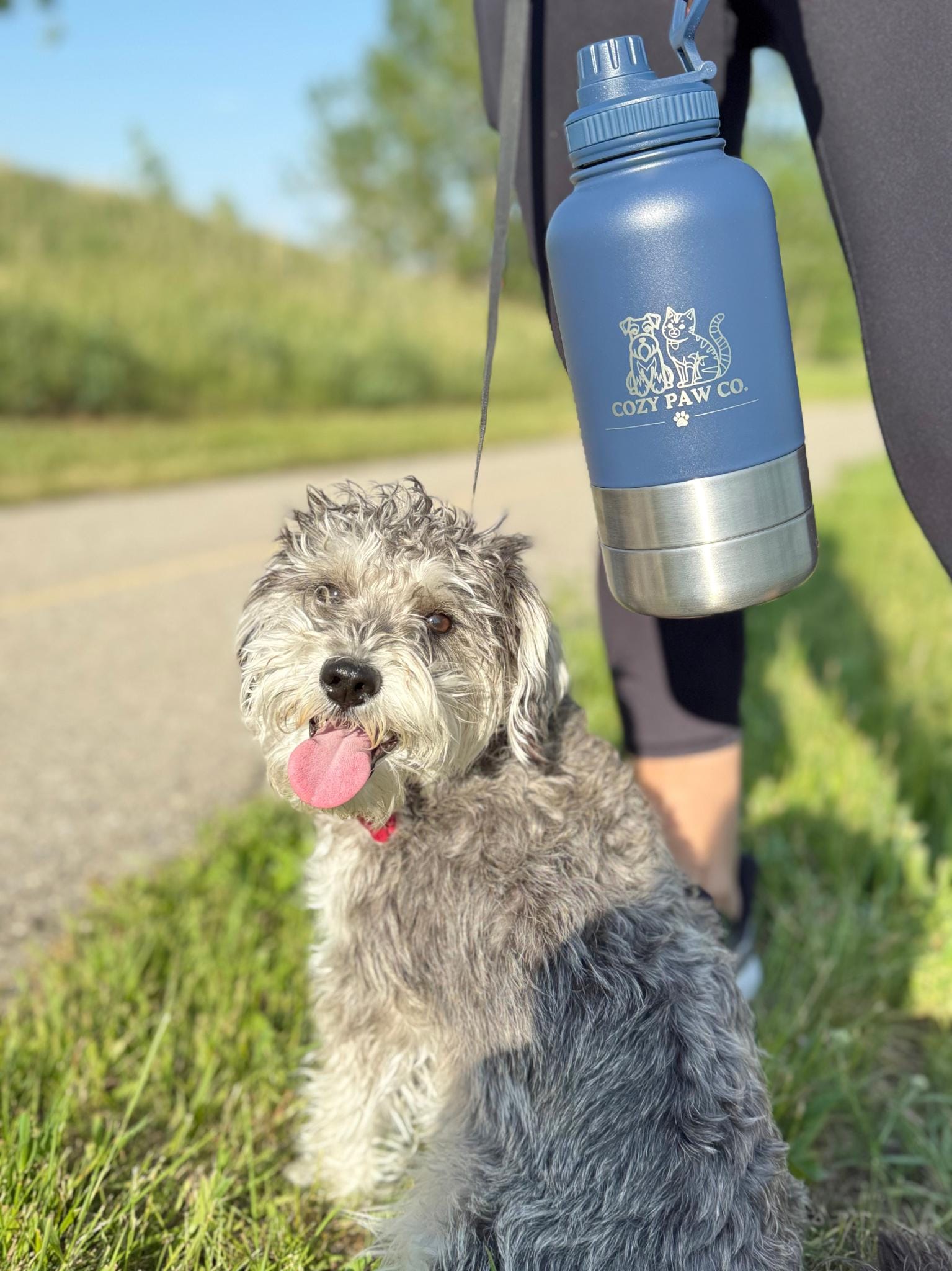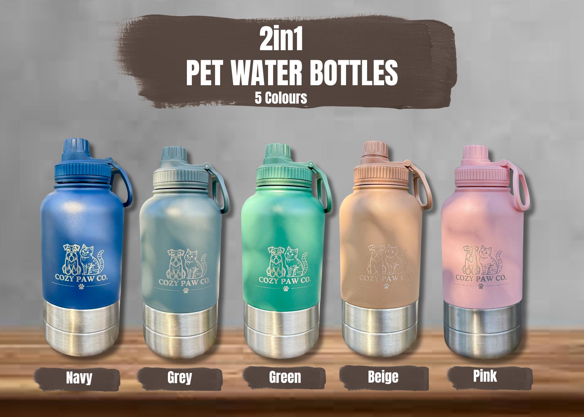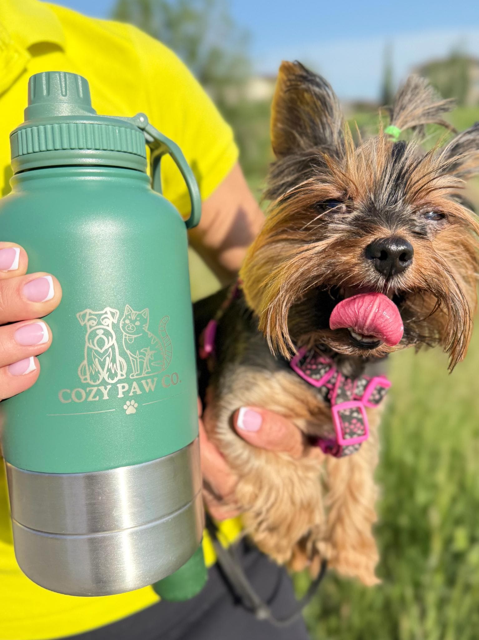 2in1 Summer-Ready Dog Travel Bottle – 1L Insulated Stainless Steel with Built-in Bowls, Leak-Proof for Hiking & Beach Trips