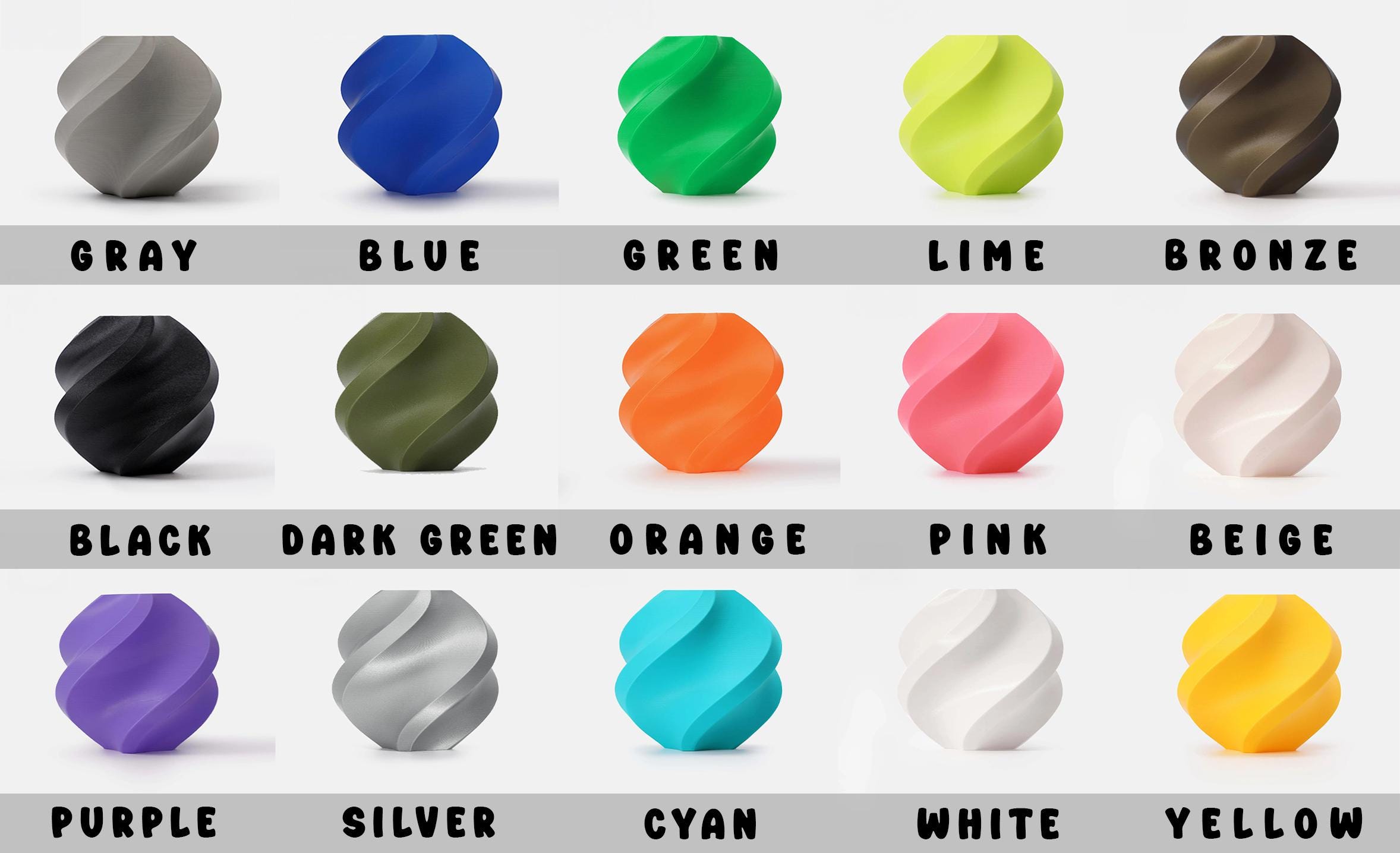 Lime, Gray, Bronze, Dark green, Black, White, Green, Orange, Blue, Cyan, Red, Yellow, Silver, Pink, Purple, Beige